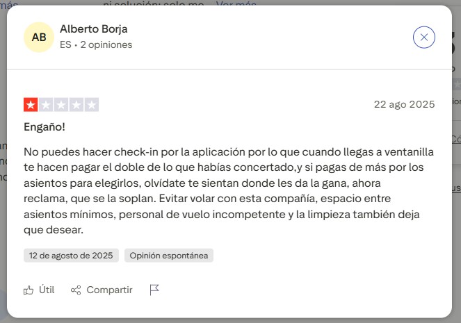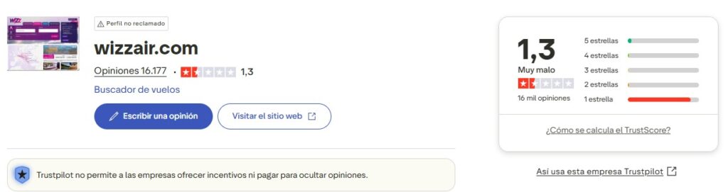 La valoración general en este sitio fue de 1.5/5 con ~16.157 reseñas; 90% 1★ recientes. ¿Qué decian las opiniones? cobros por check-in en aeropuerto, fallos web/app y problemas de reembolsos. Eso sí hay un Sesgo: La plataforma es mayormente usada para quejas; volumen y recencia la hacen relevante. Trustpilot